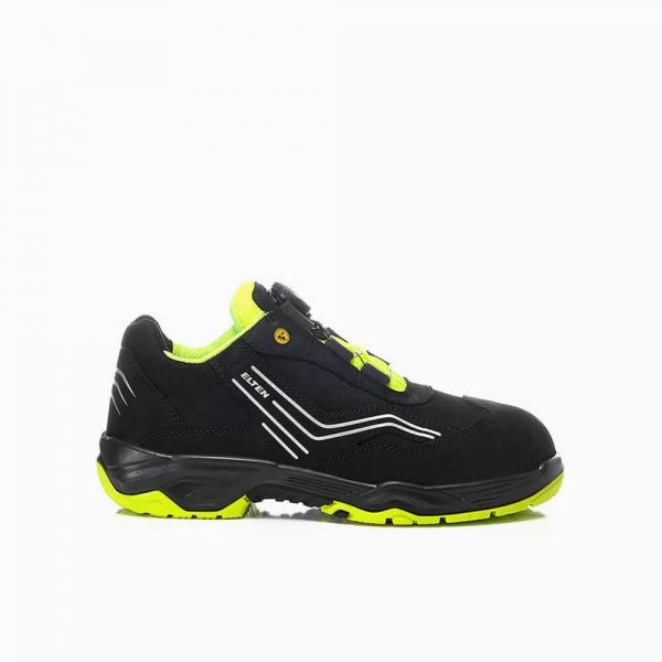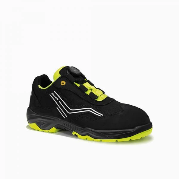 Der AMBITION BOA® Low ESD S2 ist ein ESD-fähiger Sicherheitsschuh aus der ELTEN Dimension Pro Serie und in den Größen 36 bis 48 lieferbar. Mit dem BOA® Fit System ist der Sicherheitsschuh schnell und mühelos zu schließen und öffnen. Außerdem sorgt das BOA® Fit System für eine millimetergenaue, präzise Passform. Durch das hydrophobierte Nubukleder und Textilmaterial des Schaftes ist der AMBITION BOA® wasserabweisend und strapazierfähig. Eine Besonderheit dieser Sicherheitsschuhe ist die besonders effektiv dämpfende DIMENSION PRO Sohle mit rutschhemmendem „Wabendesign“ und speziellen Kontaktflächen für fast reibungsloses Drehen auf der Stelle – besonders für harte, oft glatte Böden von Industriehallen geeignet. Eine semi-orthopädische Einlegesohle und atmungsaktives Textilfutter erhöhen den Tragekomfort. Der Ambition BOA® Low im sportlichen schwarz-gelben Design ist in den Größen 36 bis 48 erhältlich und für individuelle orthopädische Veränderungen zertifiziert.